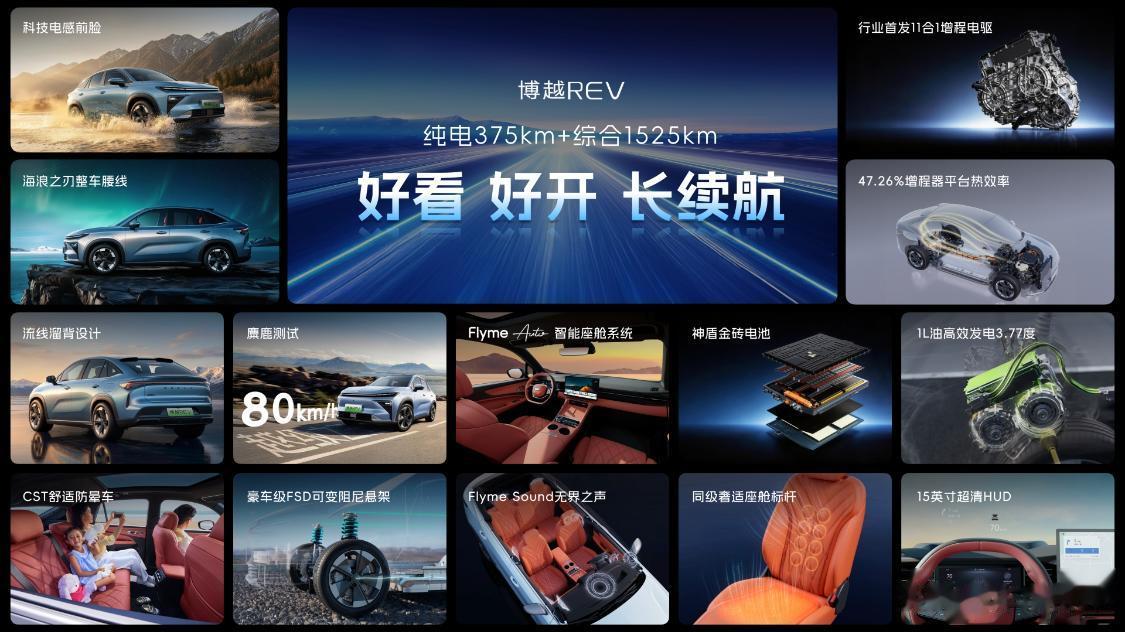 相比十年前的“好看、好开、好智能”,博越REV此次的核心优势升级为 “好看、好开、长续航”,但智能同时还在。 375km的最高纯电续航、1525km的综合续航,远超10万元级同级市场产品,它的到来也进一步完善了博越家族智电时代的产品矩阵。
