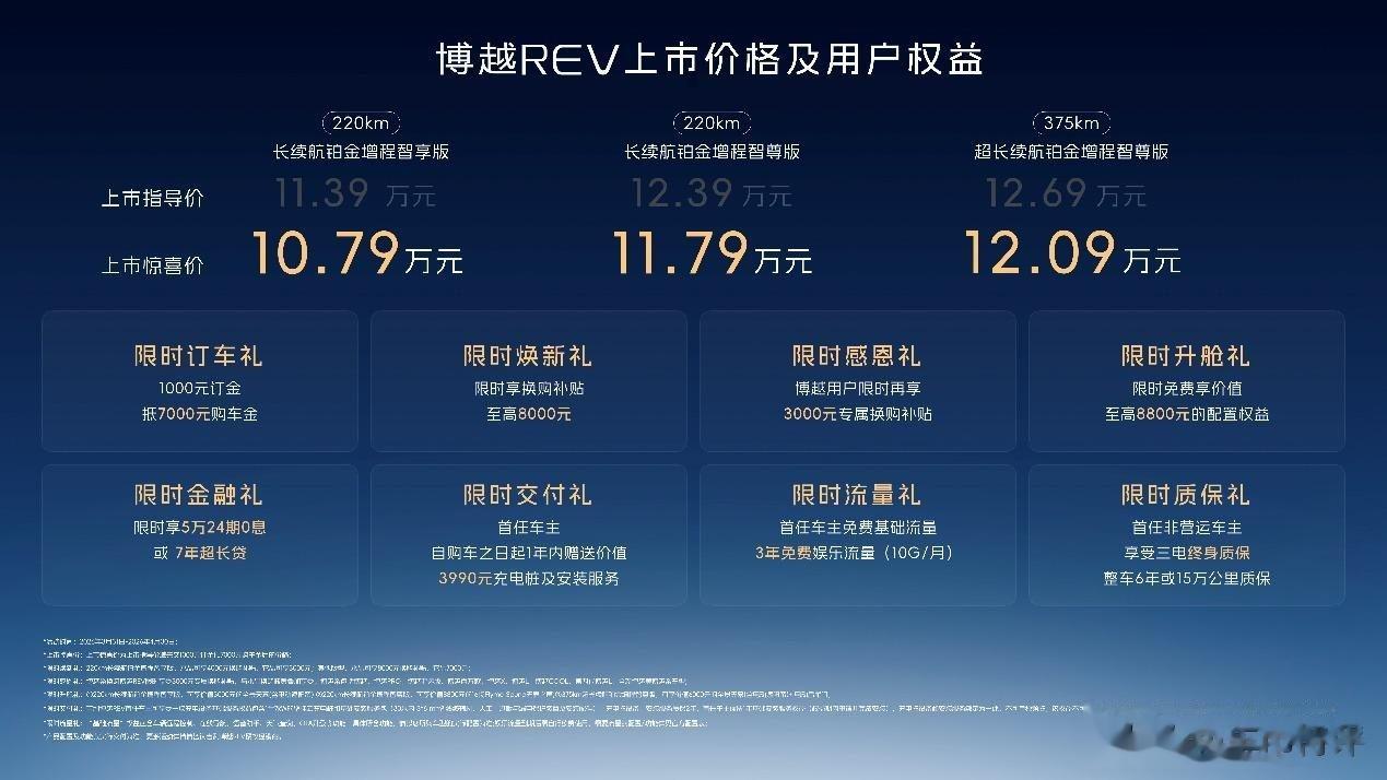 博越REV新车上市价格区间10.79万-12.09万元,共推出220km长续航铂金增程智享版、220km长续航铂金增程智尊版、375km超长续航铂金增程智尊版,三大版型,给用户带来了更多购车选择。相比此前12.79万元的预售价,价格下探了整整2万元。