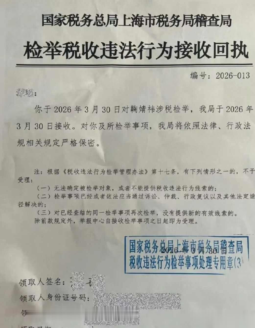 双方对这份协议的真实性各执一词,法院两次委托的笔迹鉴定,均无法判断签名的真伪,官司陷入漫长拉锯。3月30日,丝芭传媒向上海市税务部门提交实名举报信,指控鞠婧祎2024年申报收入1100万元,实际收入却超过5000万元,瞒报比例接近88%。税务部门当日受理举报,启动稽查程序。一天之后,鞠婧祎工作室发布声明,全盘否认偷税指控,称艺人始终依法纳税,已配合完成税务核查程序,同时起诉丝芭传媒诽谤。