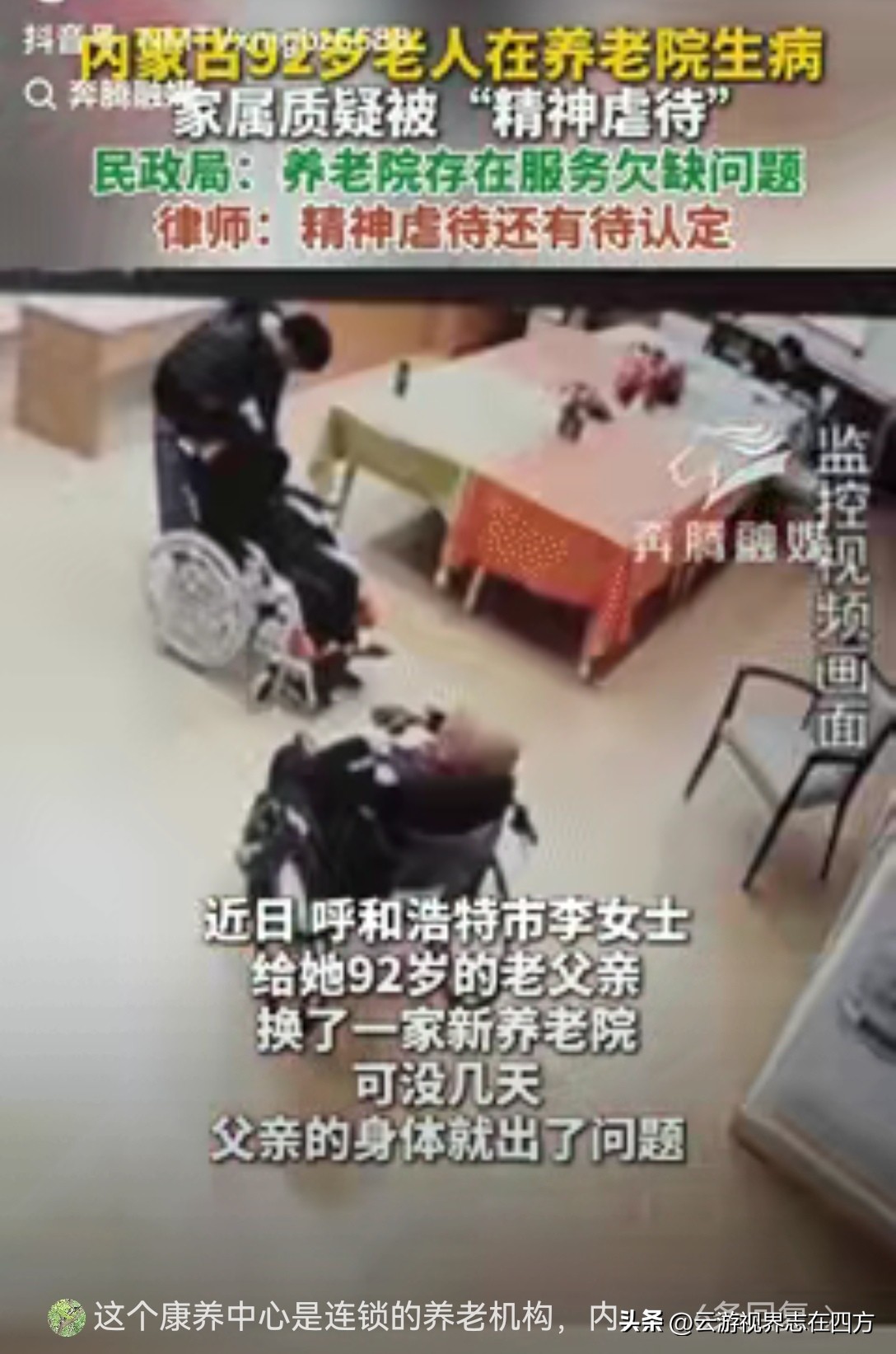 92岁老人按响五六十次呼叫铃,无人回应;坐在轮椅上三小时被遗忘;泡脚水凉透没人管;护理垫共用、洗脚盆闲置……最终老人重病入院。这不是故事,这是发生在内蒙古呼和浩特一家“五级资质”高端养老院的真实丑闻。