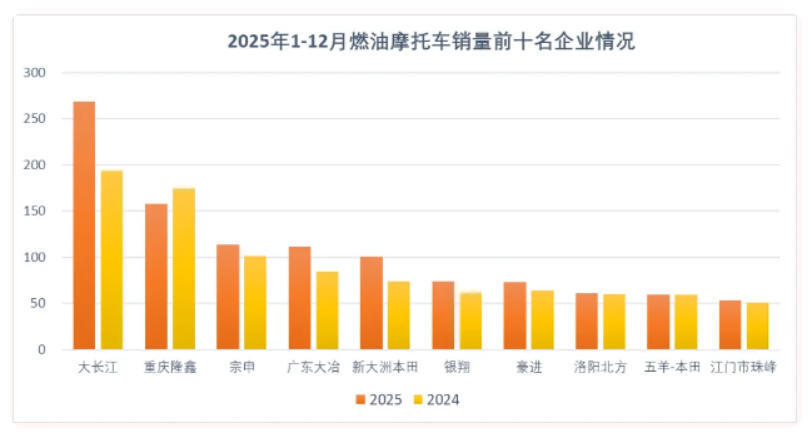 在激烈的市场竞争中,头部企业的优势愈发明显。头部企业通过规模优势支撑研发与品牌投入,形成正向循环,进一步拉开与低价竞争者的差距。2025年,燃油摩托车销量排名前五的厂商依次为:大长江、重庆隆鑫、宗申、广东大冶和新大洲本田。其中,大长江集团(豪爵和铃木是其核心品牌)的表现尤为突出,它以268.67万辆的年度销量稳居榜首,旗下产品不仅畅销国内,而且出口到80多个国家和地区。