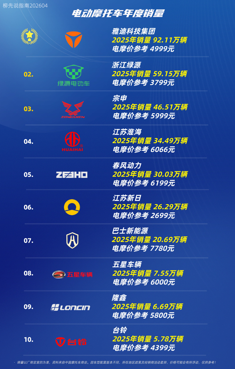 中国电动摩托车市场的竞争格局进一步明朗化,头部企业凭借品牌、渠道和供应链优势持续扩大市场份额,而腰部及尾部企业则面临更加激烈的同质化竞争。根据行业公布的销量数据,全年电动摩托车厂商销量排名呈现出明显的梯队分化特征。