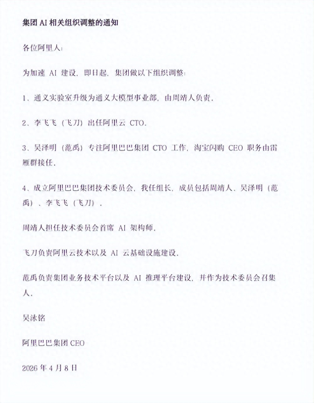 继3月成立ATH事业群后,最近,阿里CEO吴泳铭在内部信中宣布AI相关组织调整,包括新设立集团技术委员会、升级通义大模型事业部,以加速AI建设。随之而来的是人事调整,集团技术委员会由吴泳铭担任组长,成员包括周靖人、吴泽明、李飞飞。