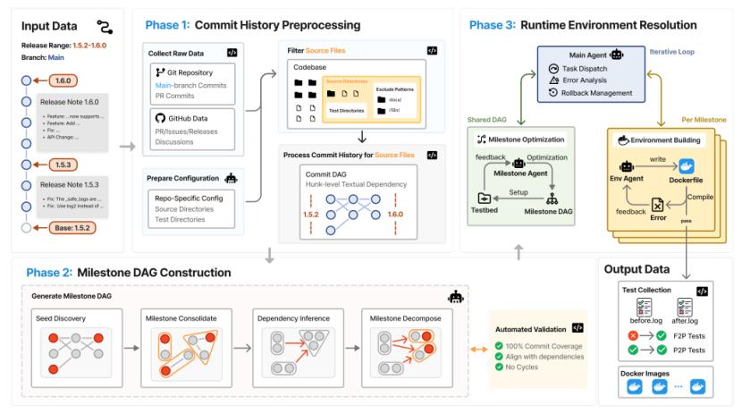 为了支持从大量开源代码库中提取出高质量软件演进历史,研究人员基于顶尖 AI 强大的能力,提出了一套 Agent 驱动的自动化流水线 DeepCommit,首次实现将嘈杂的 Git 开发记录重构为可验证、功能内聚的里程碑任务依赖图(Milestone DAG),并为每一个里程碑构造出评估环境。主要包括三个阶段:Git 历史预处理、Agent 驱动的 DAG 构建以及里程碑环境配置与验证。