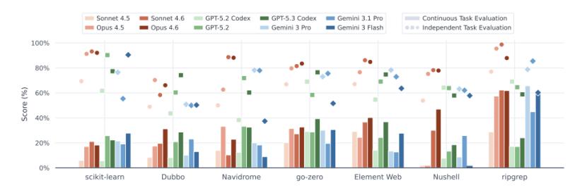 结果显示,顶尖 AI 能在独立评估任务中表现优异(得分 80%+),一旦进入长周期的真实场景,即便是综合得分最高的 Claude Opus 4.6 也只获得了 38.03% 的得分。这意味着,AI 对于执行自由度更高的任务容易偏离轨迹,其距离真正能够处理长周期、连续的软件演进工作仍存在显著差距。