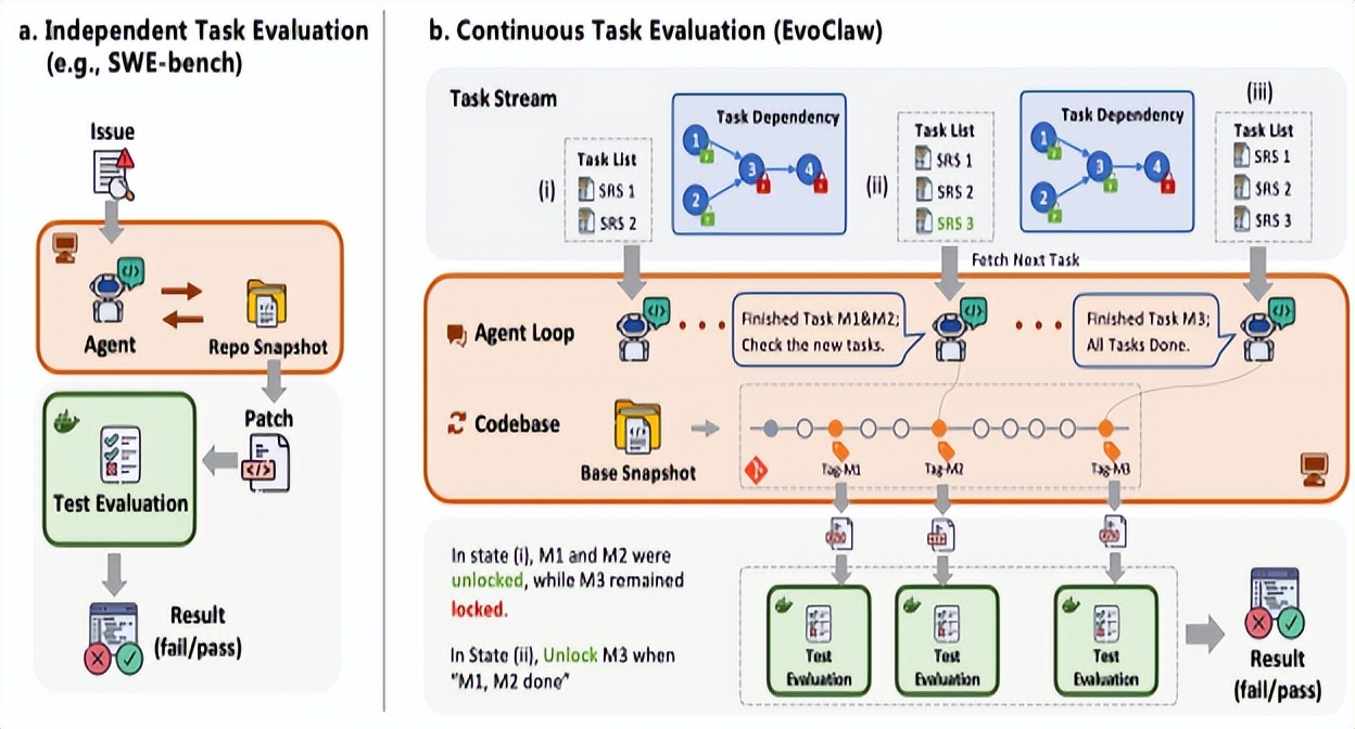 图丨独立任务(如 SWE-bench)与持续演进(EvoClaw)的评测范式对比(来源:arXiv)