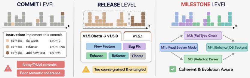 具体而言,人类专家的 Milestone 通常在局部时间窗口内,先定议题再归拢提交,是一种自上而下的语义切分;DeepCommit 为保证绝对准确性,从提交之间的依赖关系出发,自下而上地重建软件演进脉络,更强调拓扑结构与执行约束。