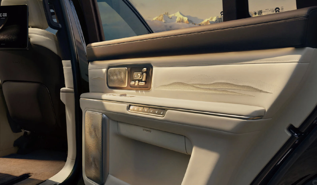 这台ES9上有很多中国设计元素,从东方雅韵的车身配色、中轴对称的座舱布局,配合苏绣纹理、水墨山云装饰,再到光帆设计、卷帘式隐私玻璃,甚至连茶台都搬进了车里。