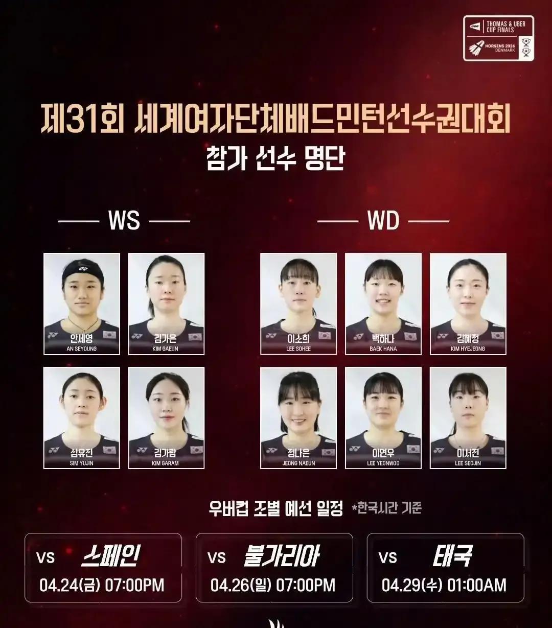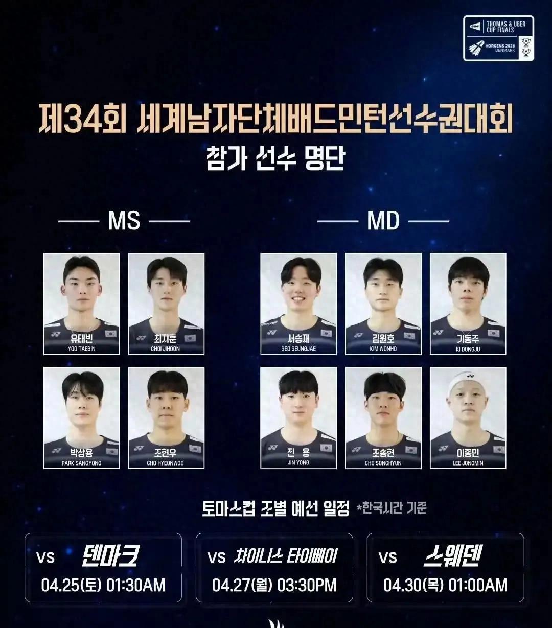 韩国队分在汤姆斯杯C组,对手包括丹麦、中国台北队等强队,男单短板将被放大,男双压力陡增,韩国男队的出线前景并不乐观。