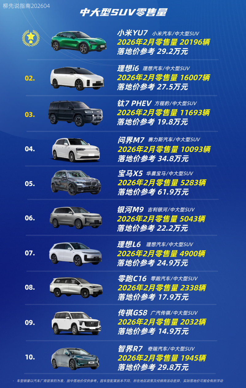 2026年2月,中大型SUV零售量排名前五的车型分别为:小米YU7、理想i6、钛7 PHEV、问界M7以及宝马X5。其中,月零售量突破一万辆的车型有四款,分别为小米YU7、理想i6、钛7 PHEV和问界M7。其中,小米YU7以超过2万辆的成绩高居榜首。