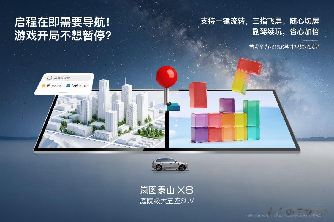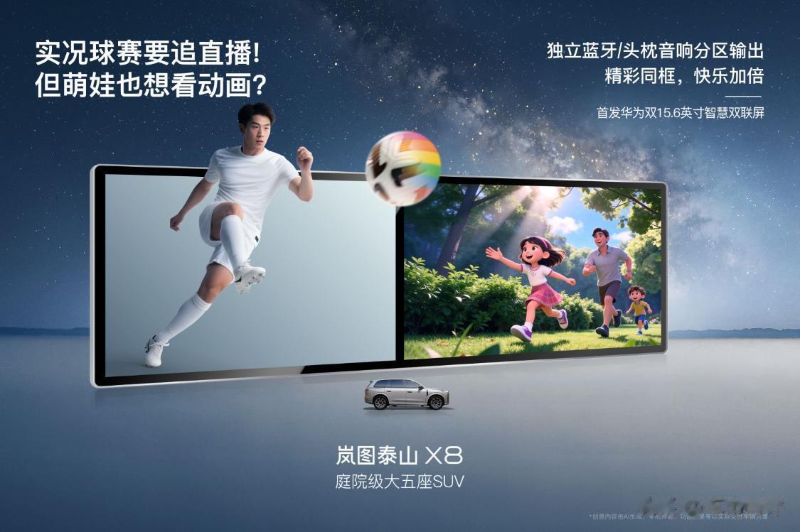 从发布“622庭院级空间标准”,给出同级最大车内6.1㎡座舱空间、二排双享零重力座椅、2米大床,到上车120度动力电池(EV)、华为896线四激光雷达,再到首搭华为双15.6英寸大双联屏,岚图泰山X8正以一套覆盖智能、空间、舒适、动力、安全的全维度解决方案,焕新家庭出行体验,重塑高端家用大五座SUV价值新标杆。