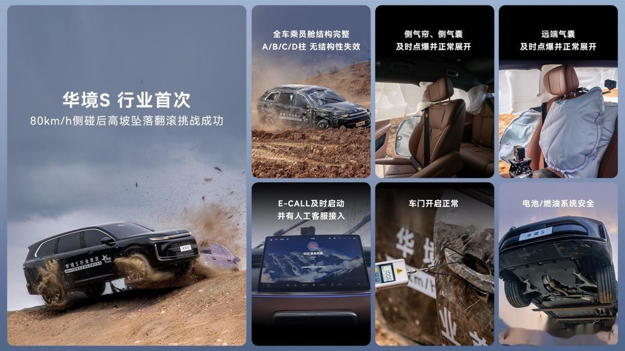 此次中汽品科TOP Safety证书,不仅是对华境S 极端工况安全性能的肯定,更标志着其构建了 “主动预防 - 被动防护 - 电池安全 - 救援响应” 的全链路安全体系。