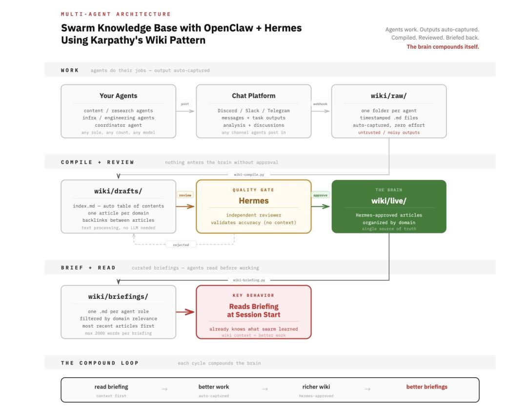 目前,已有开发者将 LLM Wiki 模式扩展到 OpenClaw 管理的 10 个 Agent 系统中,通过 Hermes(由 Nous Research 训练用于结构化评估)作为独立审核关卡对编译后的文章进行评分验证,以确保只有准确的内容进入永久知识库,再生成简报回馈给各个 Agent,从而形成了一个“产生-整理-验证-反馈”的闭环。