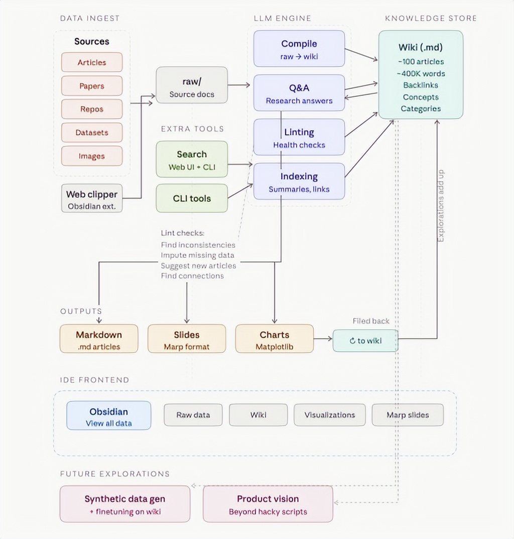 LLM Wiki 方案探索的未来目标是合成数据生成和微调。随着 Wiki 的增长,数据通过持续的 LLM 代码校对变得越来越“纯净”,有望成为更完美的数据训练集。